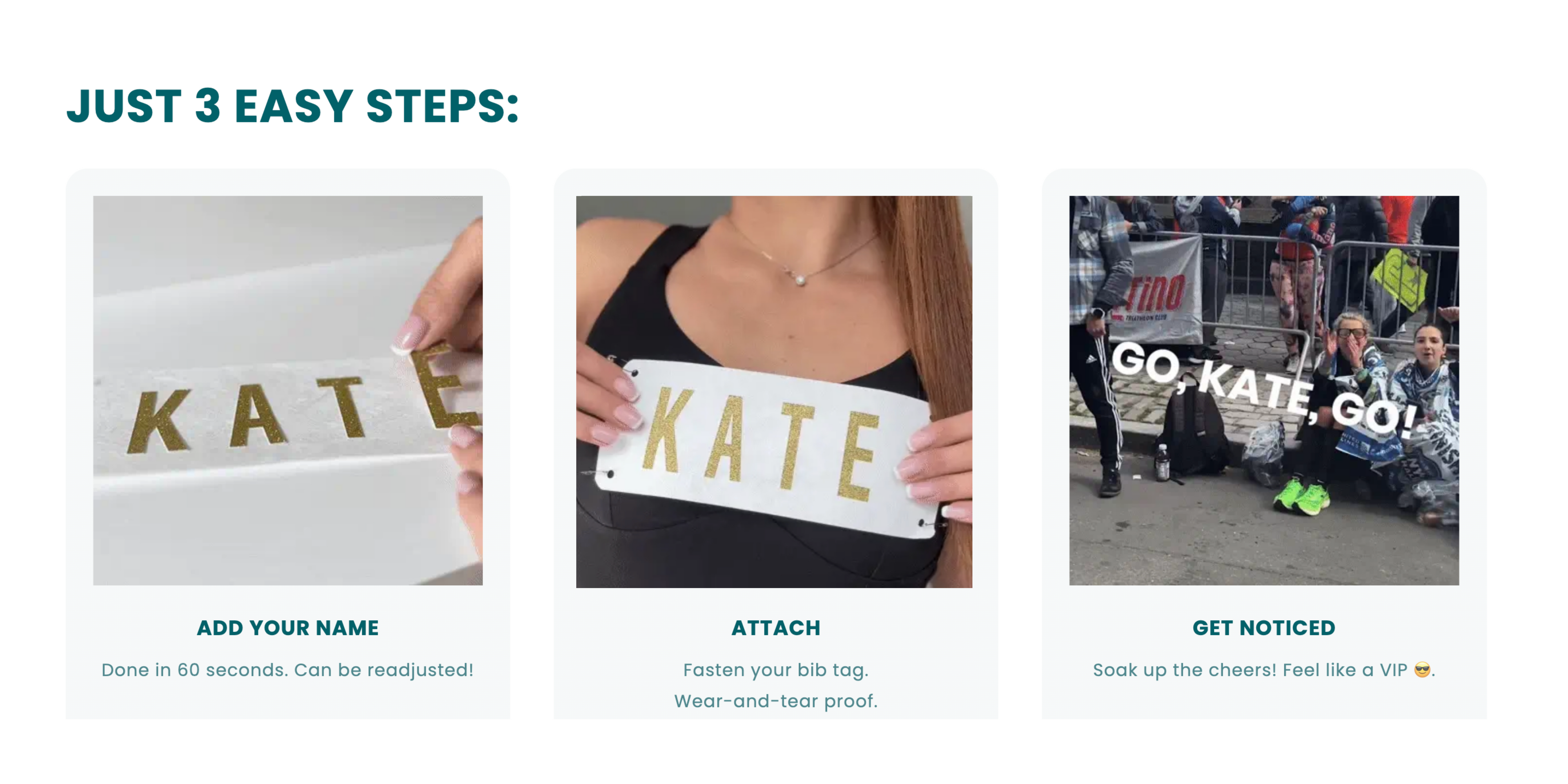 Even if your race bib already has your name on it, it’s often too small to see. This kit increases visibility so spectators can spot your name from a distance—and give you that energy boost exactly when you need it.