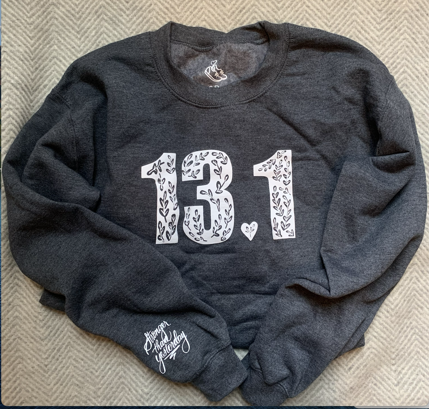 Training for and finishing a half marathon is a HUGE accomplishment. It takes time, focus, sacrifice and commitment. Take pride in all the little details of 13.1 with this sweatshirt that you can wear and be proud of your amazing half marathon accomplishment.