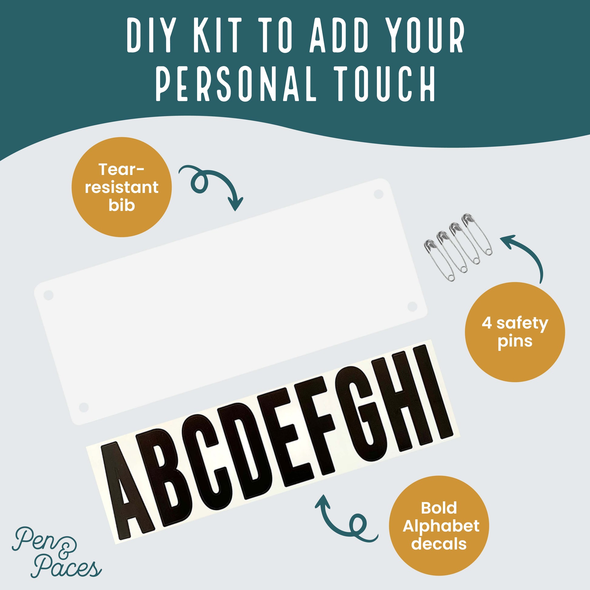 - 1 waterproof + tearproof reversible name bib (8.25" x 3.25")